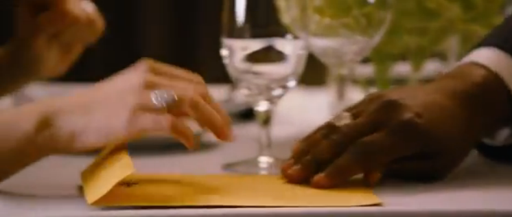 J. handing documents to Bella.